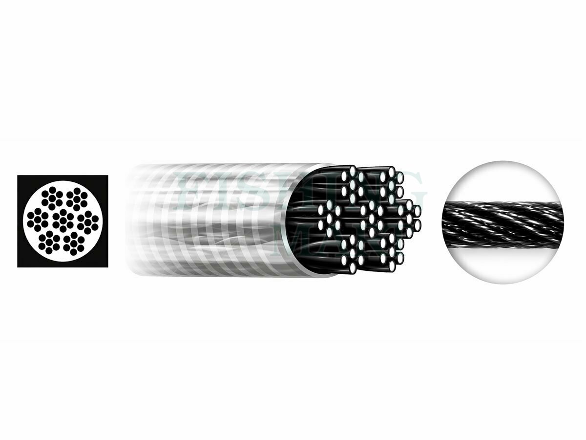 Rdzeń przyponu zbudowany jest z 49 włókien splecionych w układzie 7x7, co zapewnia bardzo dobrą elastyczność i odporność na załamania. Nylonowa, transparentna otulina dodatkowo zabezpiecza materiał, ogranicza skręcanie i zwiększa trwałość podczas regularnego łowienia.